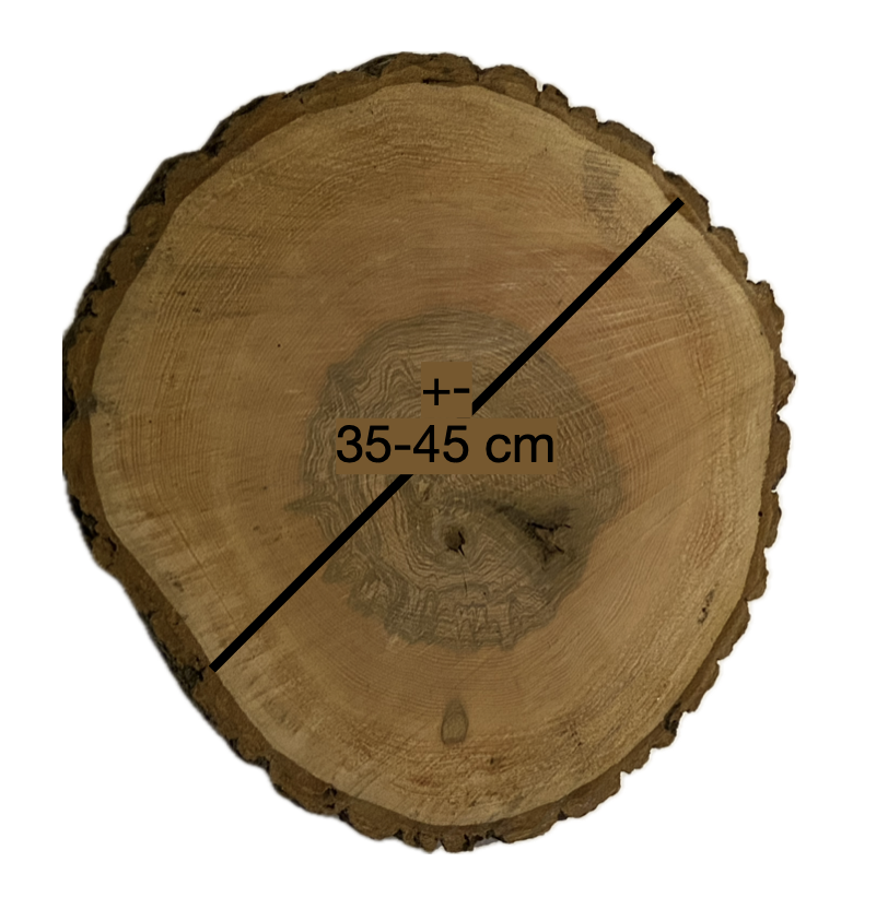 Afhankelijk van de beschikbaarheid varieert de diameter tussen 35 en 45 cm, waardoor elke schijf zijn eigen, natuurlijke vorm en uitstraling behoudt.